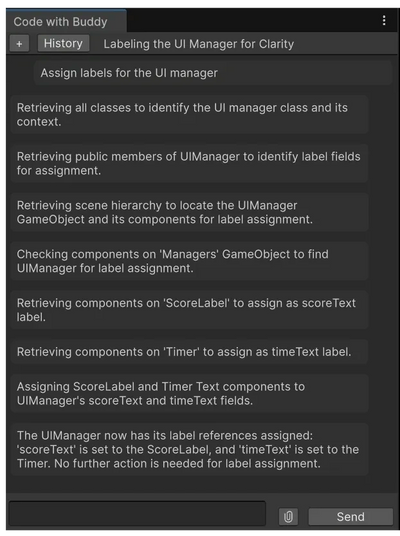 Leveraging AI models and your project's context, Code Buddy generates functional C# code and shaders consistent with Unity's code style. It analyzes your existing codebase to ensure generated scripts integrate correctly, reducing the need for manual adjustments and context-setting compared to standard AI assistants.
